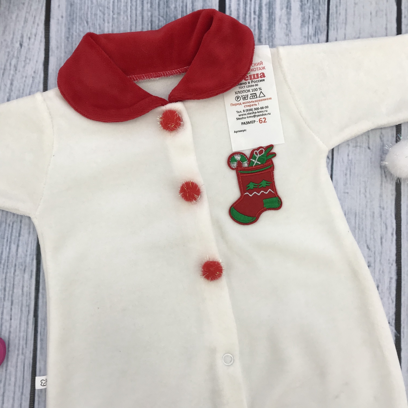 Теги: Купить оптом новогодний комбинезон от производителя. 244. Комбинезон Санта, хлопок 80% велюр 20% ПЭ, молочный 56,62,68 цена,отзывы официальный сайт "Стеша Тамбов"